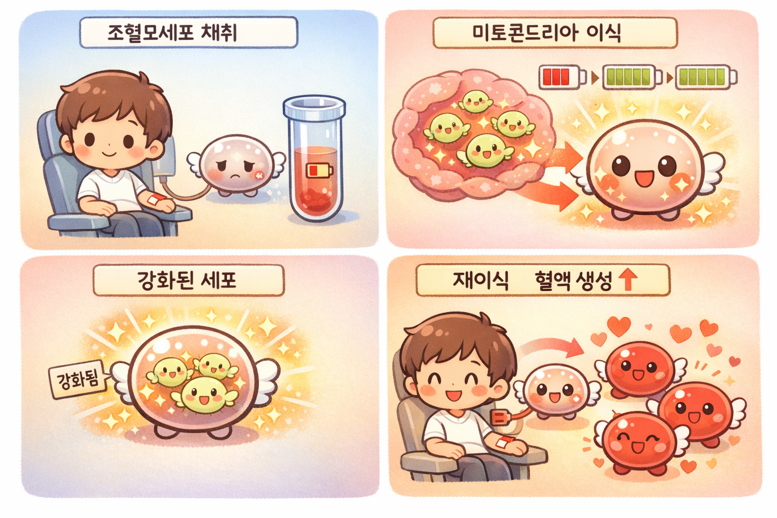 - 💊 치료 메커니즘: 심장마비로 손상된 심근세포에 건강한 미토콘드리아를 주입해요. 심장은 엄청난 에너지를 소비하는 장기인데, 심근경색 시 산소 공급이 차단되면 미토콘드리아가 가장 먼저 손상됩니다. 외부에서 건강한 미토콘드리아를 공급하면 심근세포의 에너지 생산이 재개되고, 손상 부위 회복이 촉진돼요.