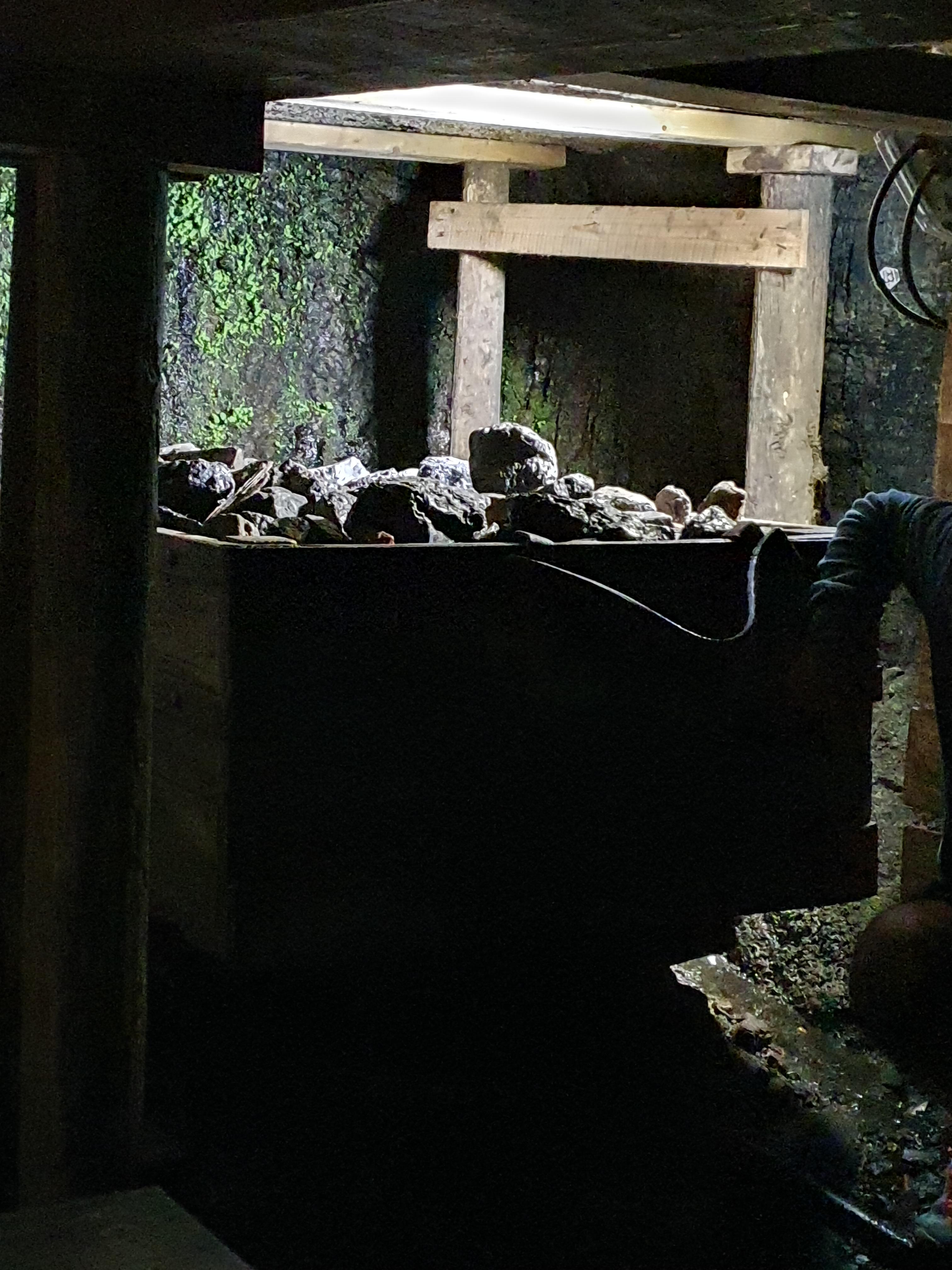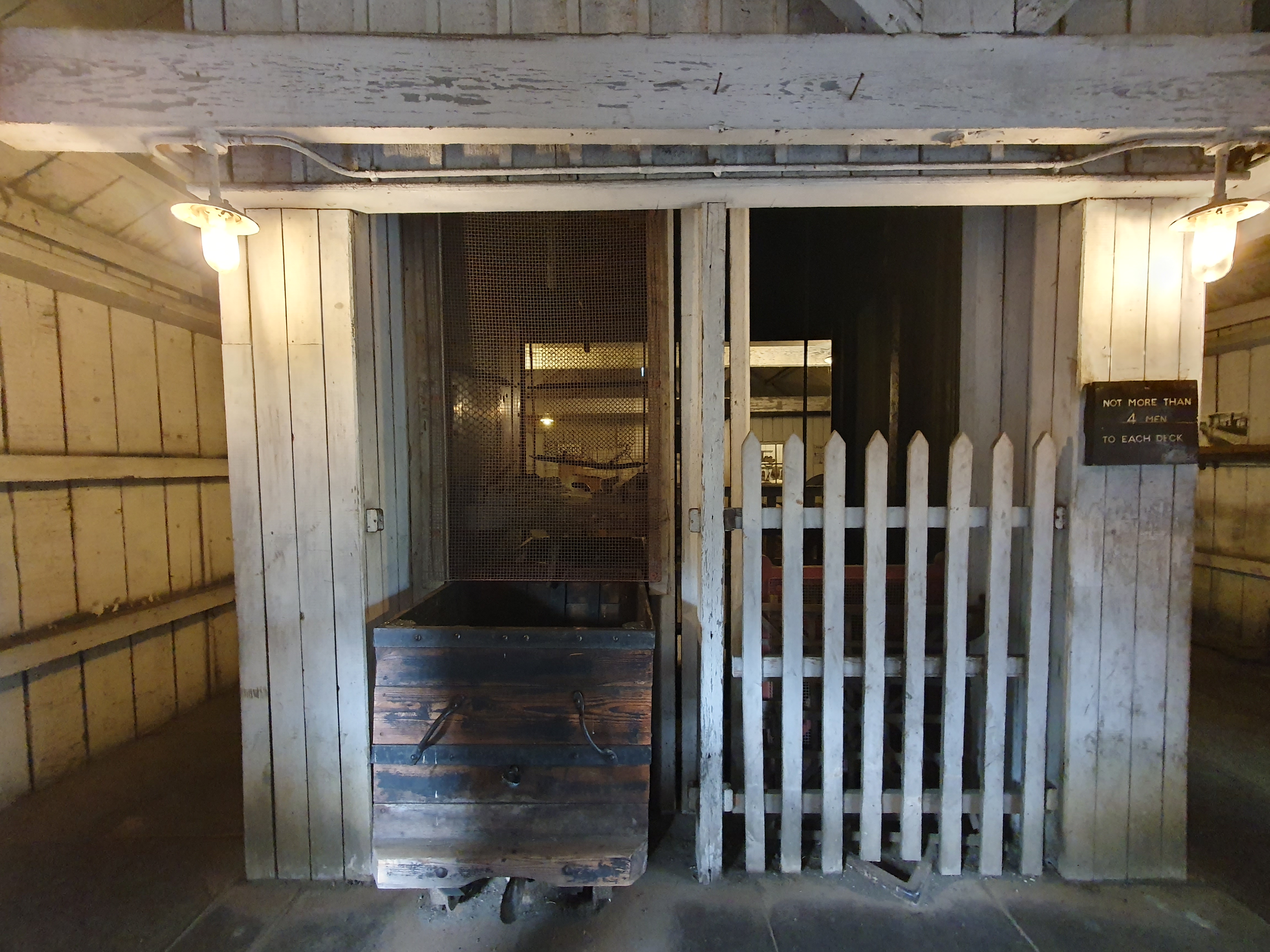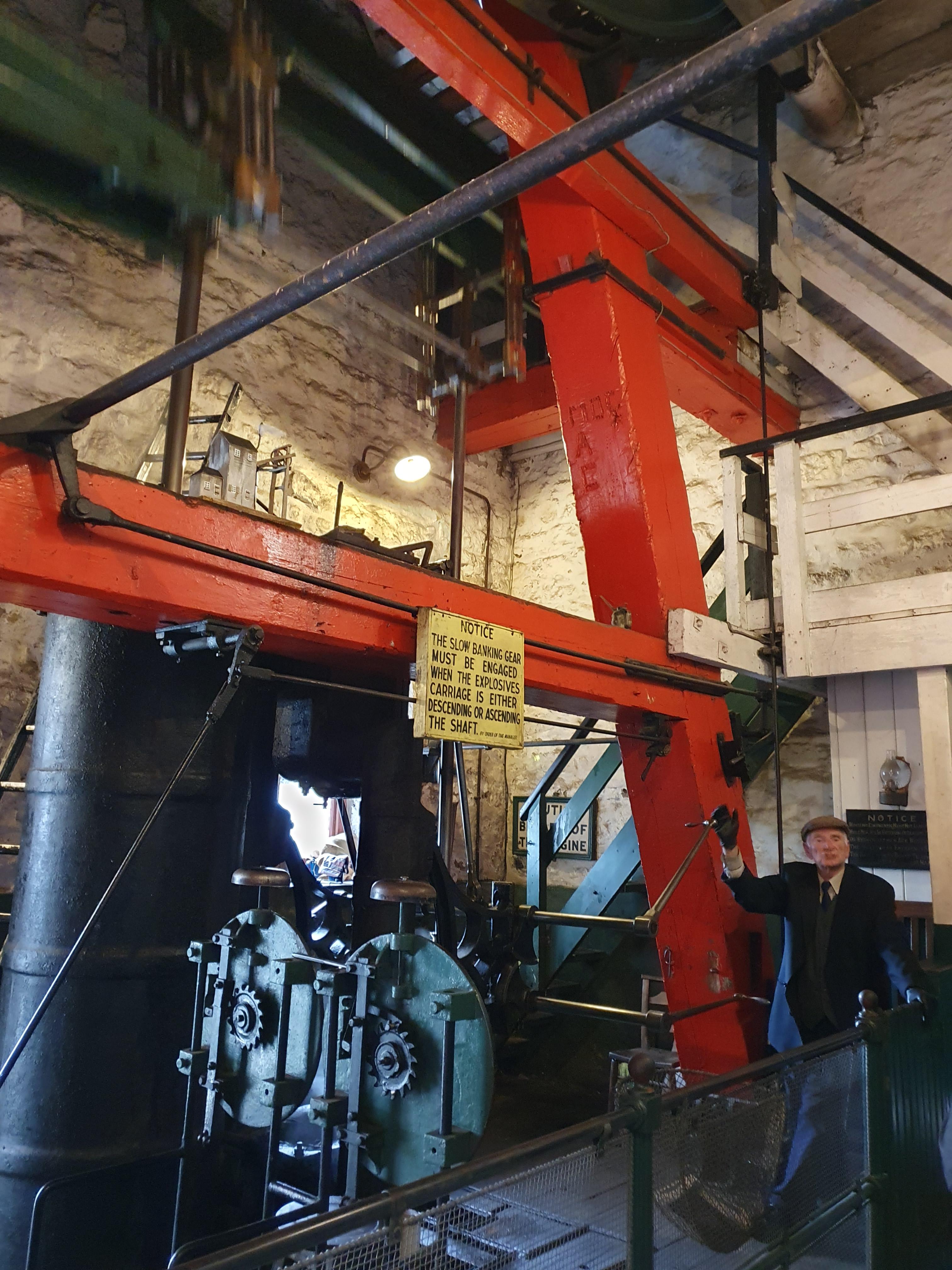 지역 출신 가이드분이 옛 증기 엔진 시연을 통해 사람과 석탄을 나르던 모습을 보여주시네요, 갱도 입구의 나무 문과 석탄 수레, ‘네 명 이상 탑승 금지’ 안내문도 그대로 재현돼 있었어요.