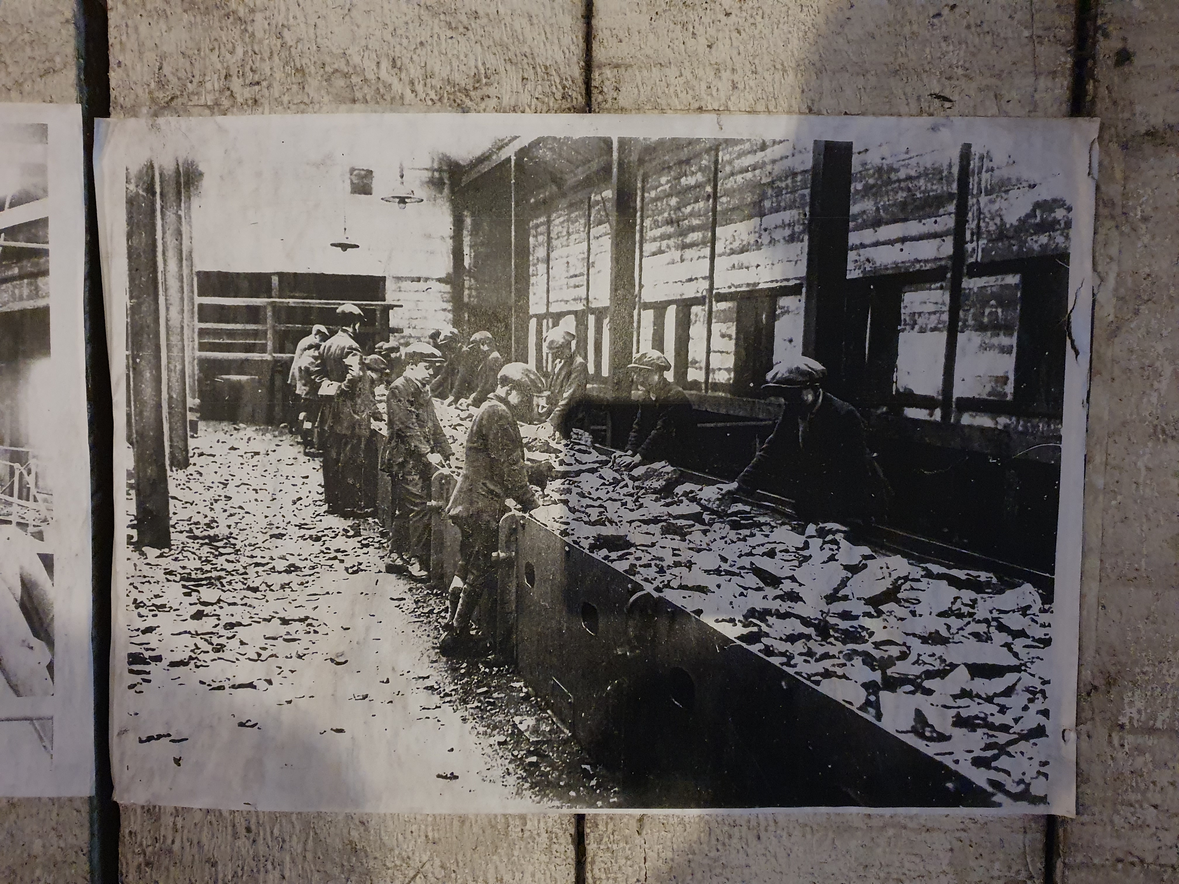 석탄을 캐내던 벽면과 도구들, 축축하고 차가운 작업 공간과 분류장에 모여 앉아 석탄을 골라내던 아이들과 노동자들의 모습(역사 사진).