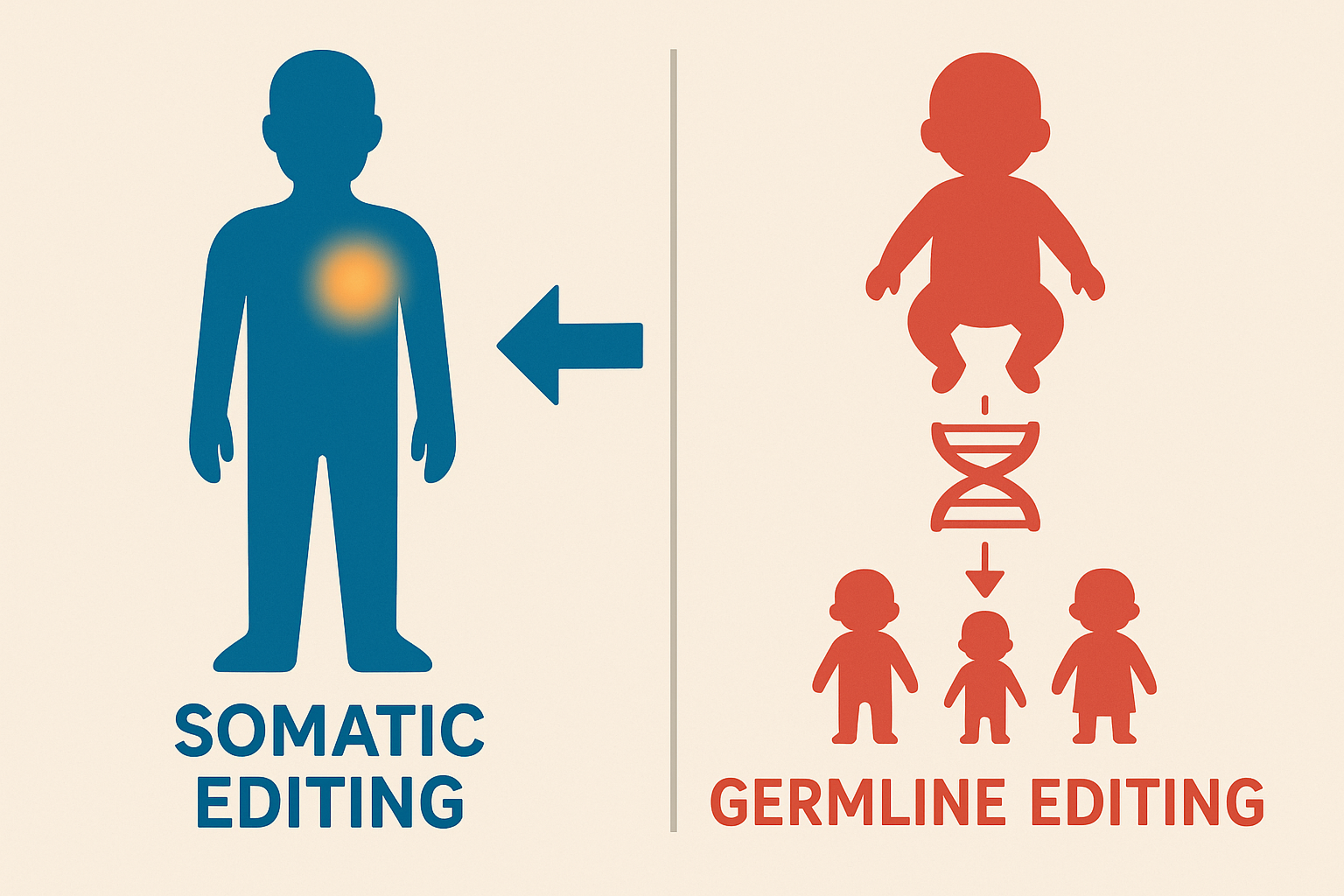 한 사람만 바꾸는 체세포 편집 vs 후손까지 영향을 미치는 생식세포 계열 편집을 비교한 도식 이미지
