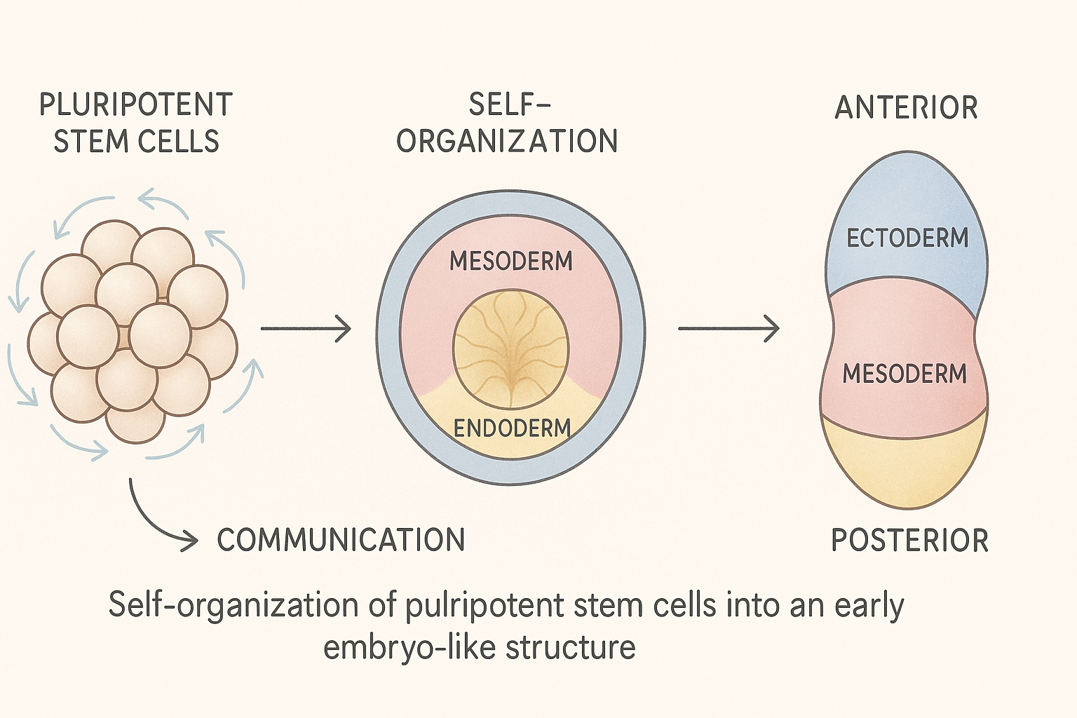 줄기세포가 모여 인공배아를 만들 때, 놀라운 점은 누가 하나하나 지시하지 않아도 세포들이 스스로 자리를 잡고 역할을 나눈다는 것입니다.