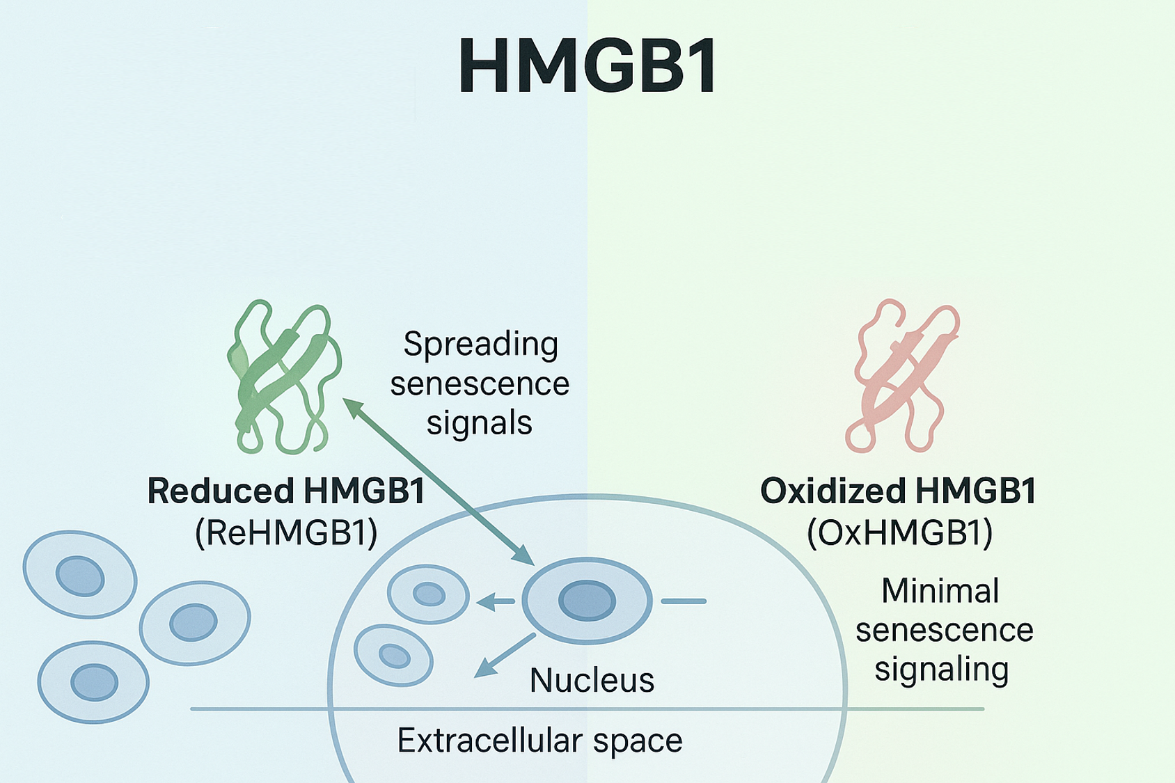 환원 상태(reduced HMGB1, ReHMGB1): 이번 연구에서 밝혀진 바로는, 이 형태가 노화를 다른 세포로 퍼뜨리는 핵심적인 신호 역할을 합니다.